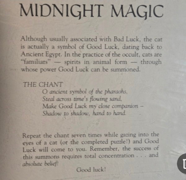The 1977 Vintage Springbok Challenger series Black Cat “Midnight" puzzle is a 500+ piece jigsaw puzzle featuring a black cat theme. Made of cardboard, this puzzle is part of the Midnight Magic series and is recommended for ages 17 and up. Despite being 48 years old, The puzzle is in new condition, sealed and with only a little tear (taped up) in the packaging. A great collectable for puzzle enthusiasts, this vintage piece from the United States reflects the craftsmanship and charm of puzzles from the 1970s.