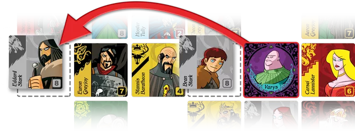 In more detail, players move Varys in orthogonal lines in a 6x6 grid, stopping it on a character token, then collecting that token and any other character from that House that you passed over. Possess as many characters from a House as someone else, and you claim the banner from that person. Collect the final character from a House, and you immediately use the power of one of six companions; since the game contains fourteen companions, the mix of powers will differ each game.