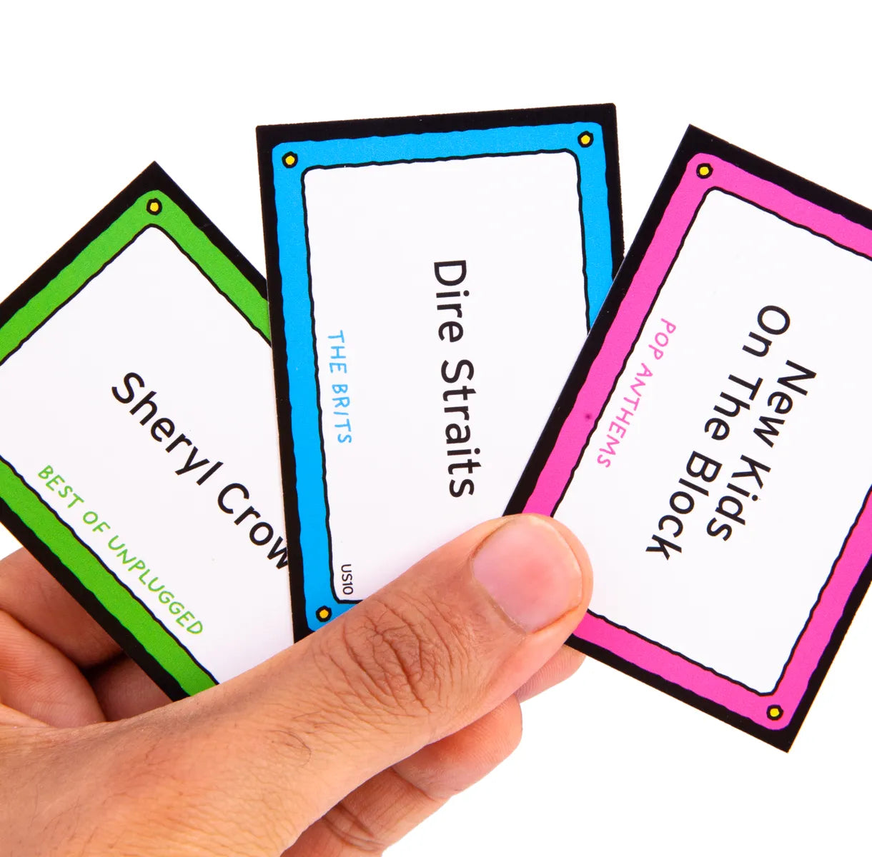 In the Artist Round, get ready to belt it out! Each player gets three Artist Cards and has 30 seconds to get their team to guess all the artists using one of three methods— using just one word; speaking the lyrics; or performing one of the artist’s songs. When a team gets one right, they add the card to their collection. The first team to grab a card from all eight categories wins and has the right to party like it’s 1999!
