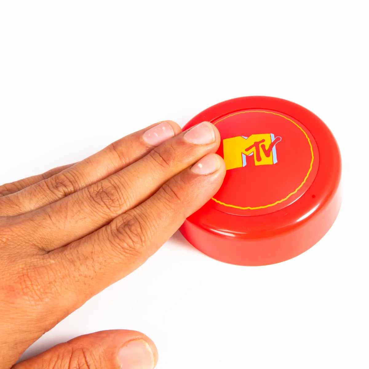 First, go head-to-head in the Quick-Fire Buzzer Round. One player from each team tries to think of a song to fit the description on the Head-to-Head category card (e.g. “Pop Anthems”) before the 15-second timer runs out, hitting the buzzer to throw the mic back to their opponent. The first person to run out of time loses this round.