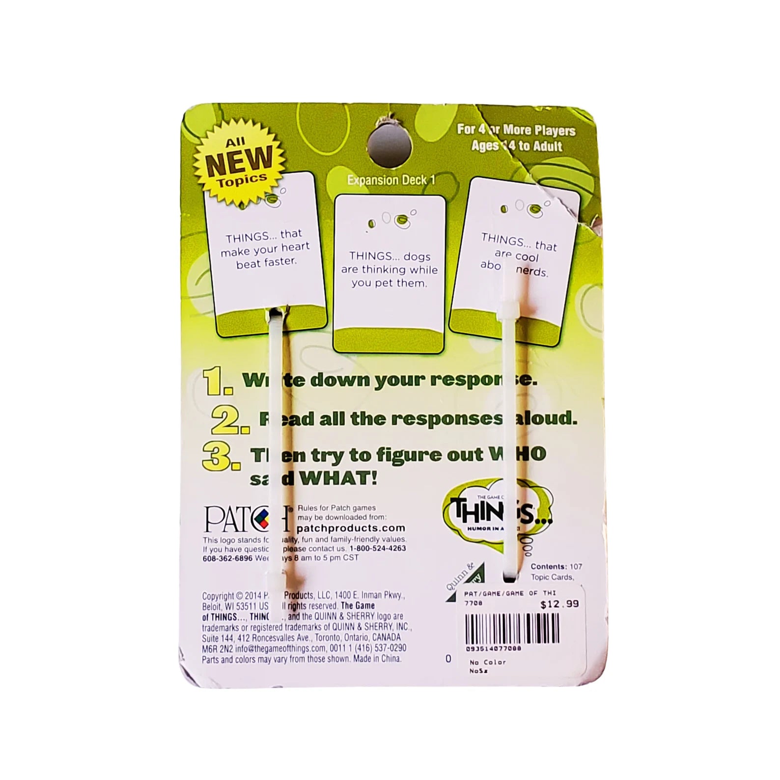 Pick a topic write a response guess who said what! This travel/expansion deck of the hilarious game of humor in a box comes with all new topics that can be played on their own, or added to your larger game! Read a topic card and then write down your response. It can be anything that comes to mind, there's no right or wrong answer! Then all the responses are read aloud and you have to figure out who said what! You won't believe the THINGS... you'll hear!
